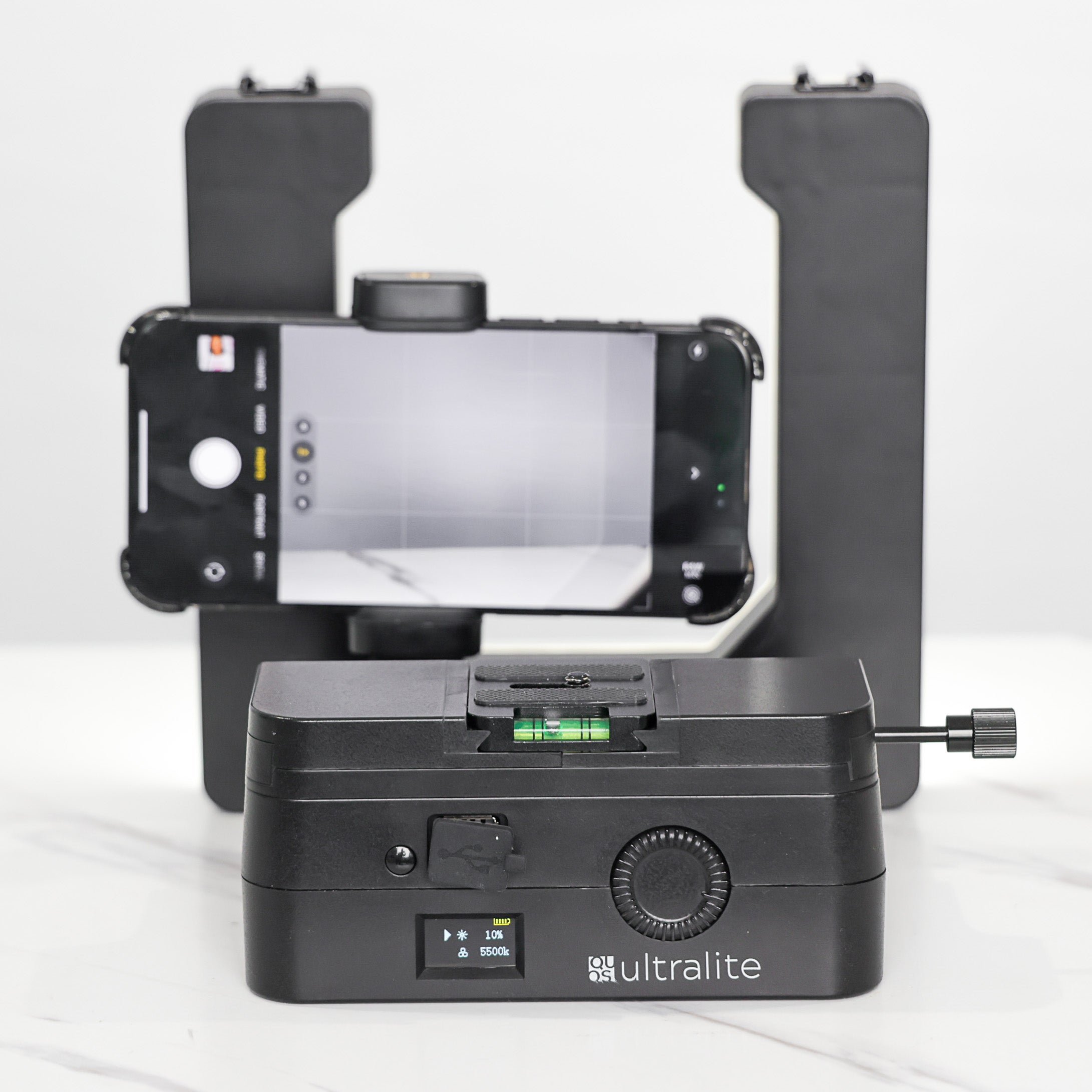 Every Ultralite kit includes the LED light, an adjustable mounting arm, a USB-C charging cable, and a protective carry case for easy transport.
