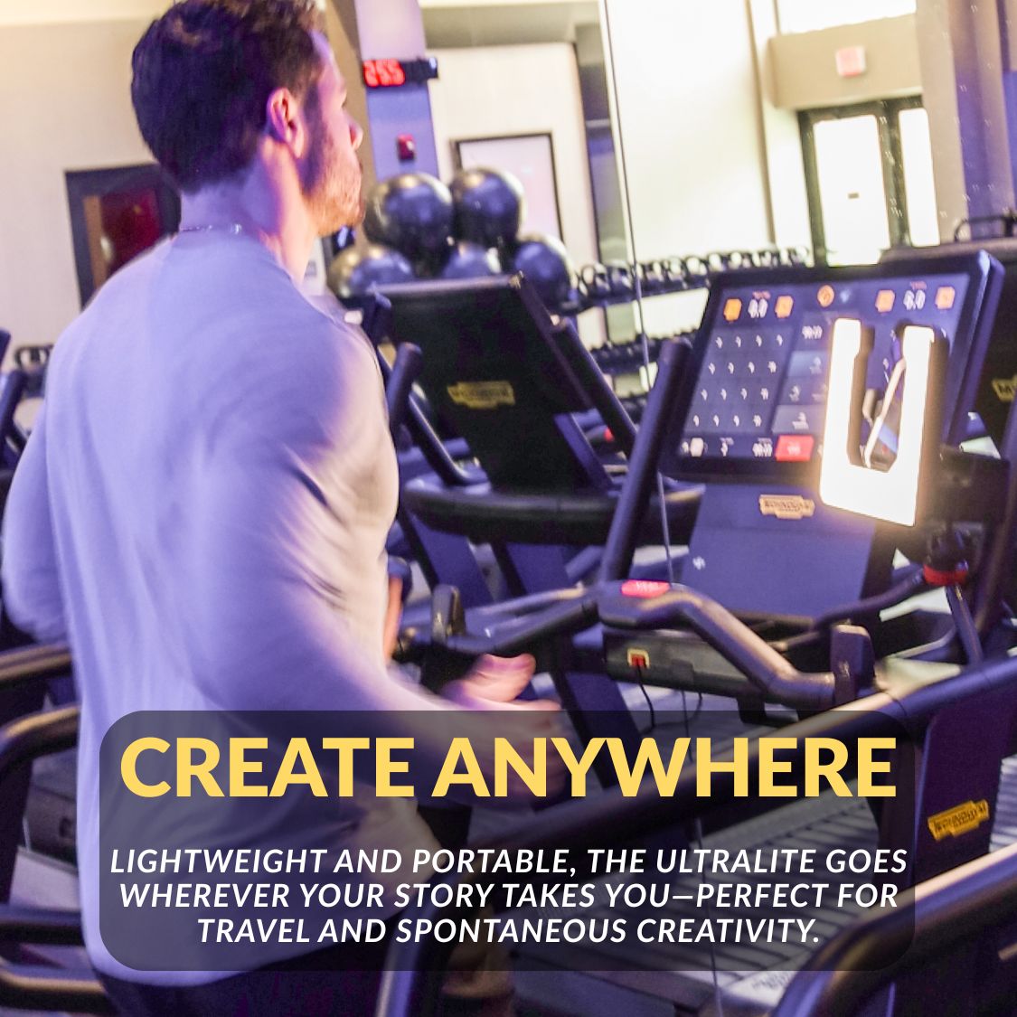 Weighing just 1.5 pounds, the UltraLite is easy to hold, turn, and shoot in normal or selfie mode without fatigue. Its battery runs up to an hour at full brightness—and even longer when dialed down—while staying cool to the touch thanks to its no-heat design.