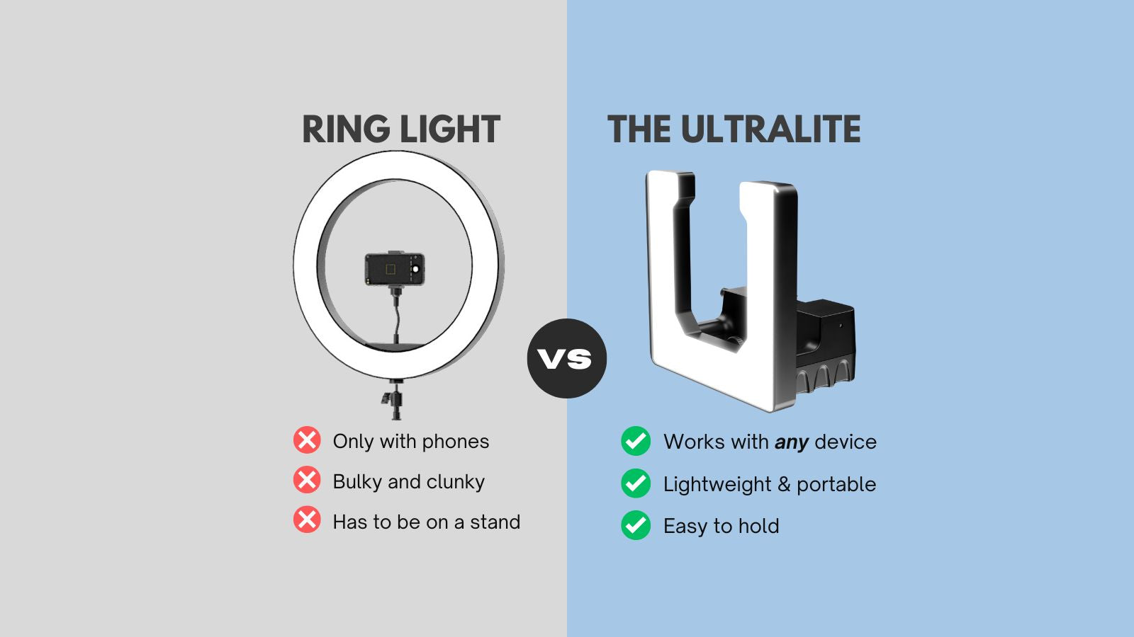 2. The UltraLite is the same shape as your face. Oftentimes, a big round ring light can leave weird shadows.
